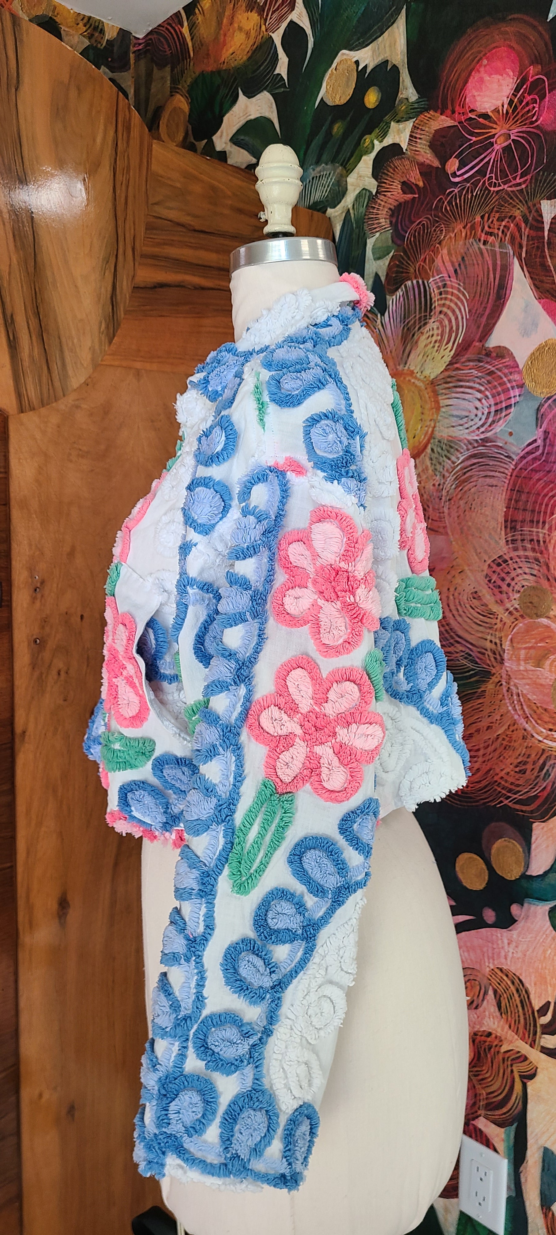 This upcycled chore jacket features a charming floral design in soft chenille. With convenient front pockets and a zipper closure, it is a practical and stylish addition to any wardrobe. Plus, its lightweight construction makes it a versatile option for all occasions.