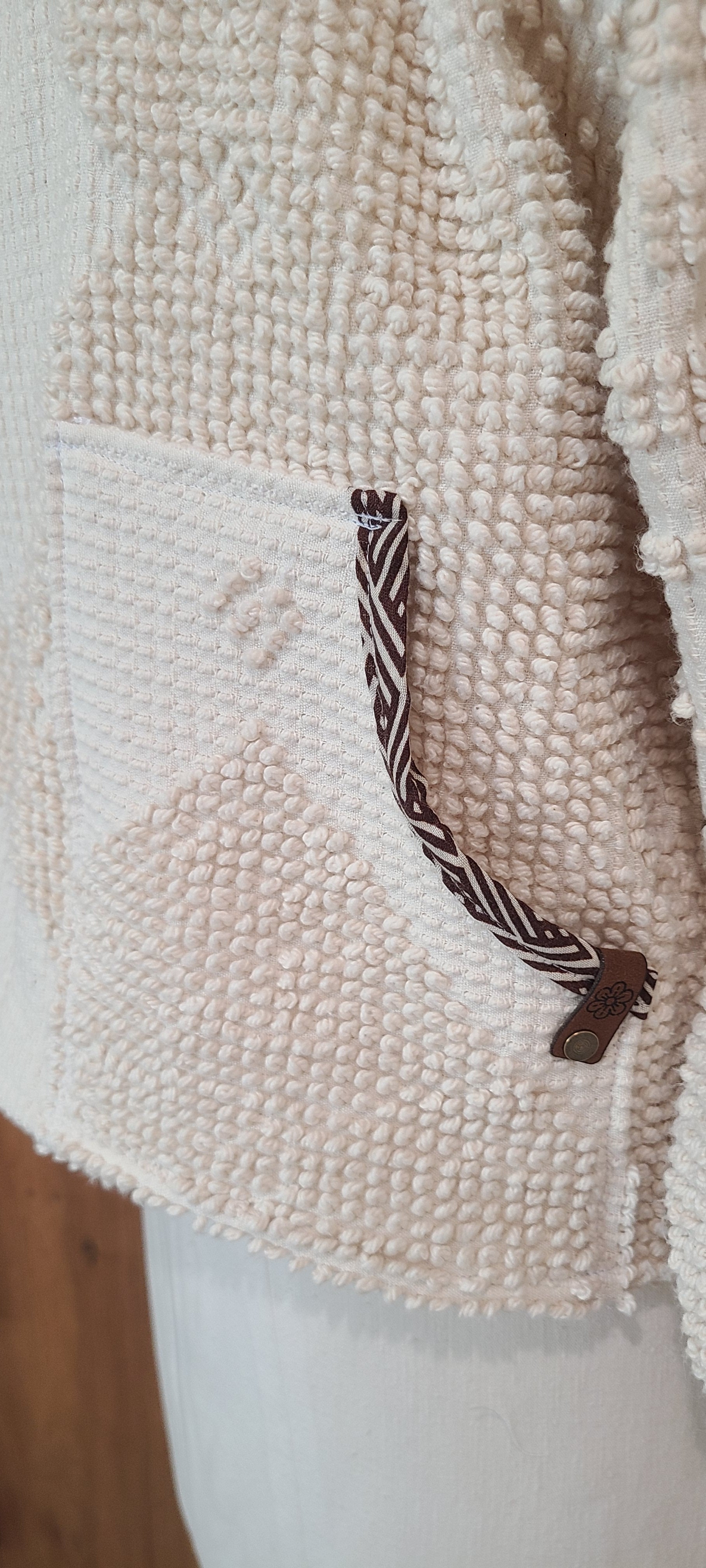 Cream chenille Chore embellished with brown and white trim on the pickets. Zipper closure