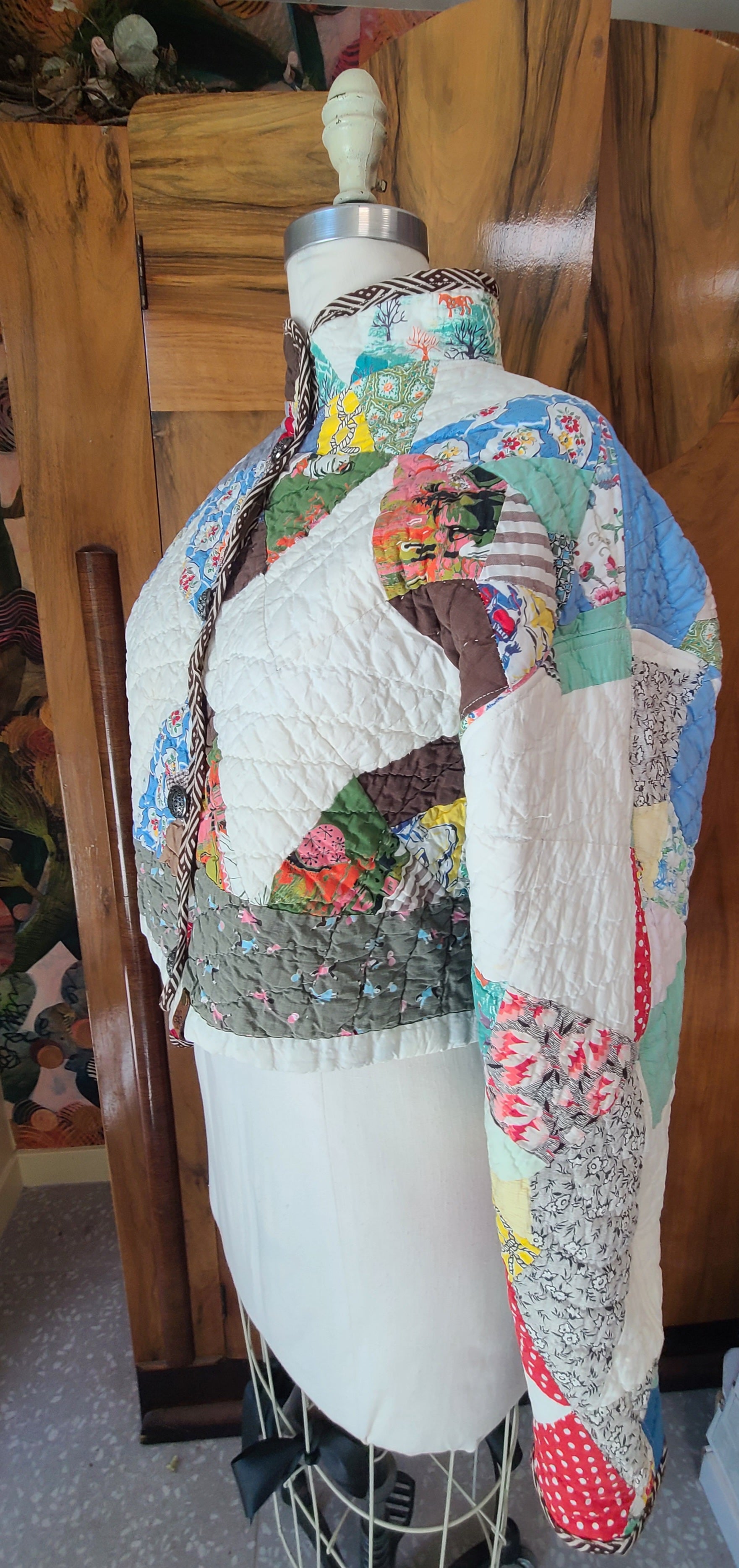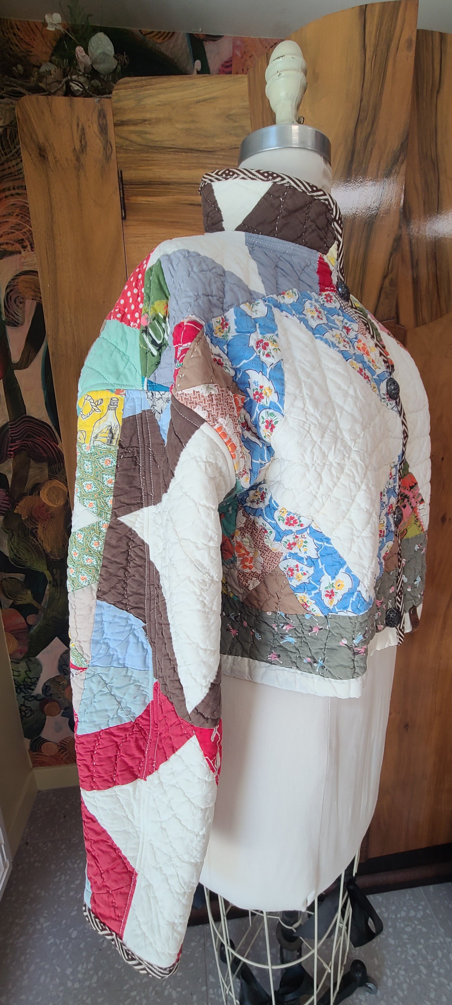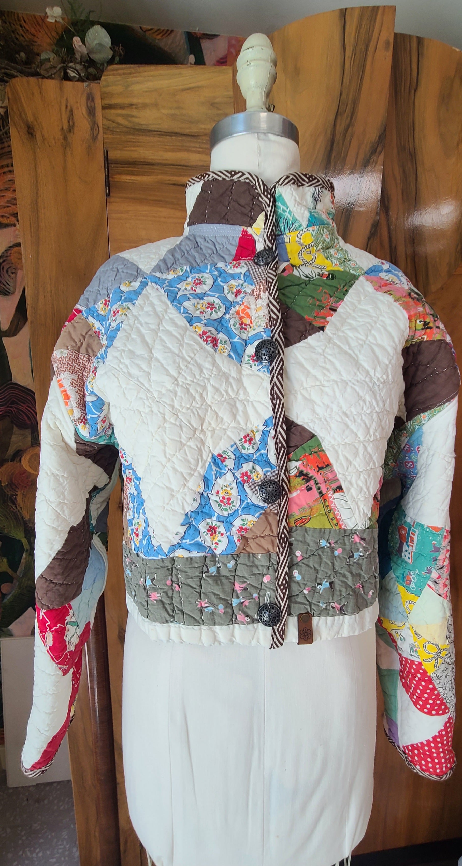 Wonderdul spiderweb vintage quilt with nostalgic prints. It is a cropped chore,button closures and mandarin collar.