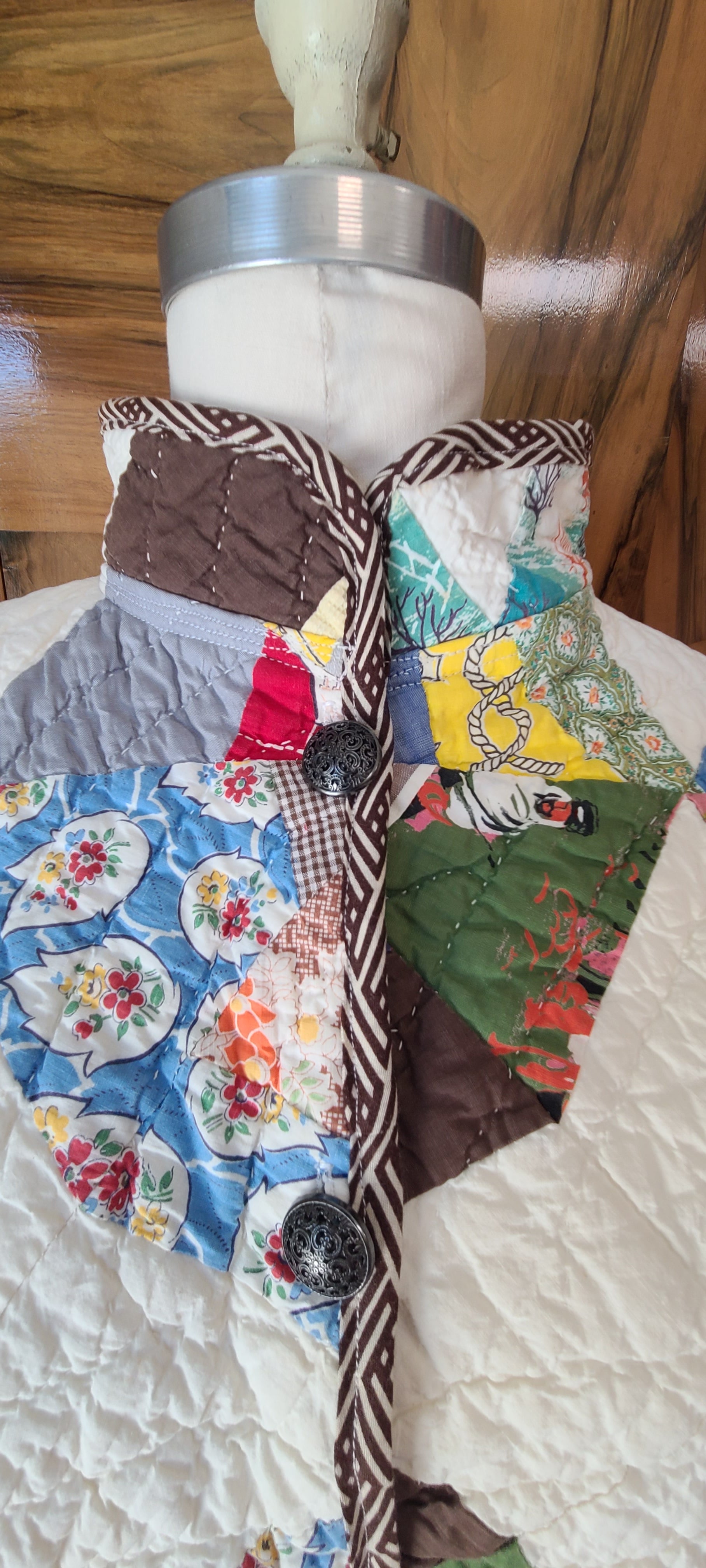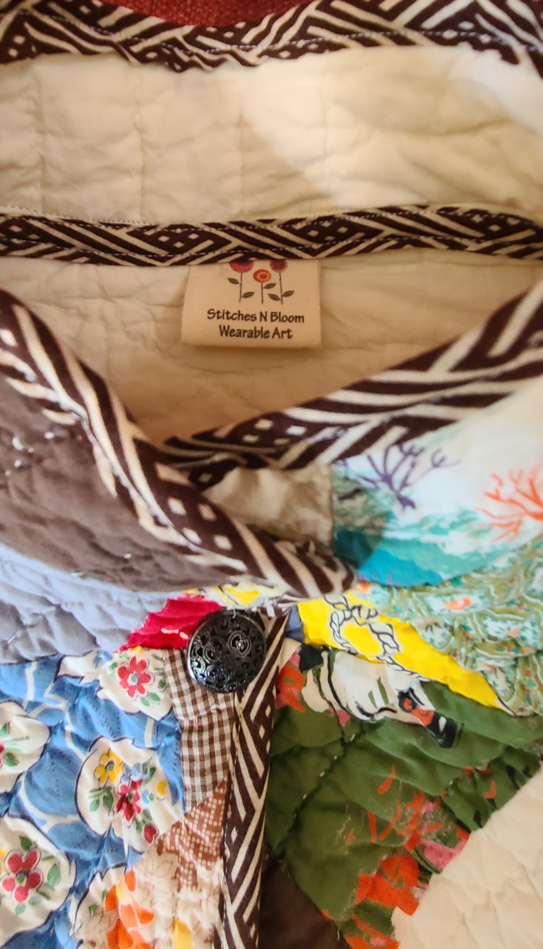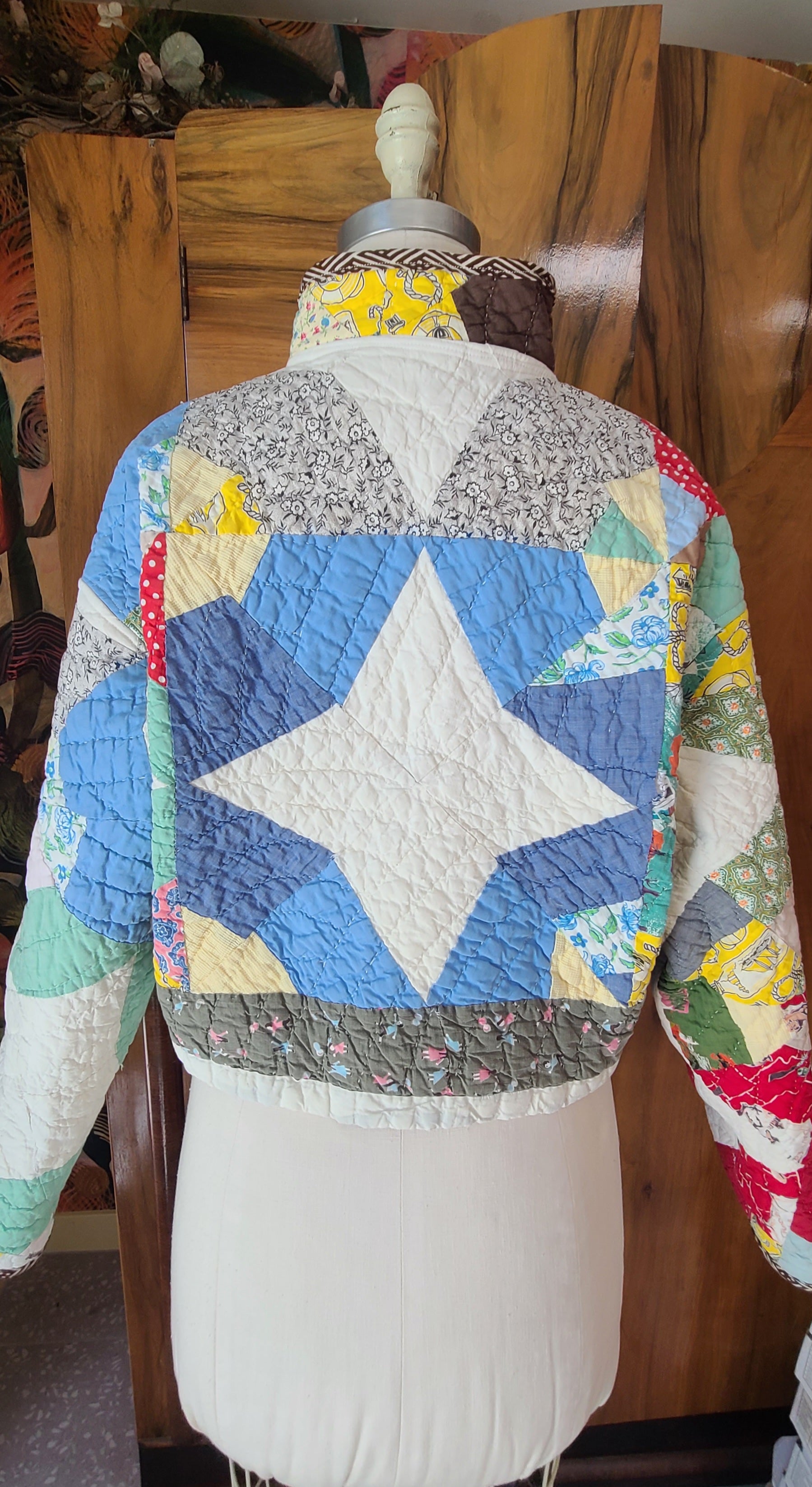 Wonderdul spiderweb vintage quilt with nostalgic prints. It is a cropped chore,button closures and mandarin collar.
