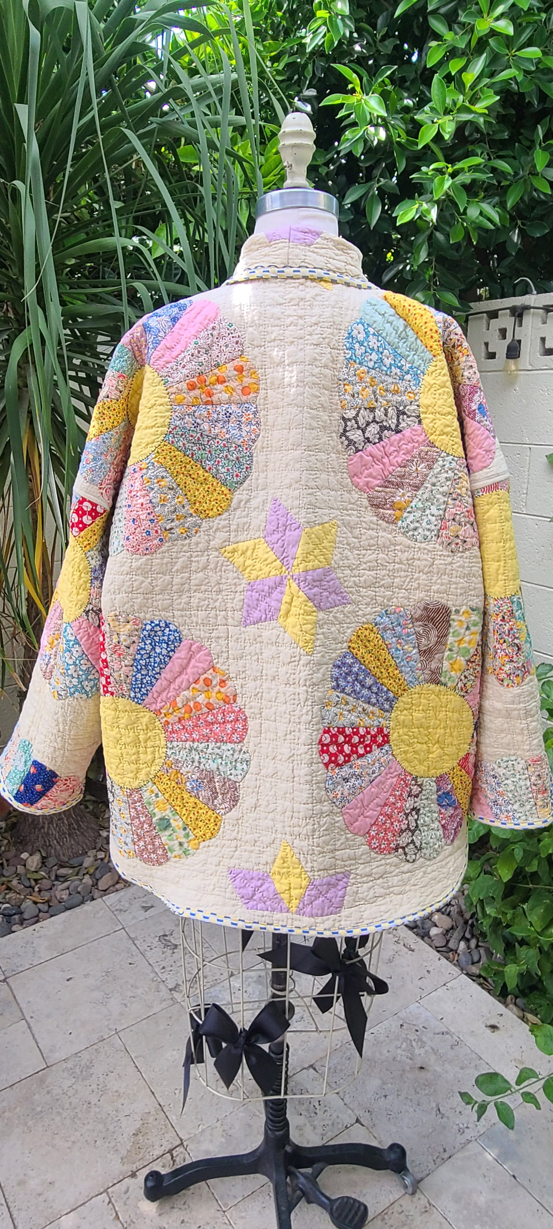 The vintage Dresden Plate quilt in Spring colors is expertly crafted with gorgeous stitching and trimmed in a stylish lemon print. The Harper, an oversized one size jacket, adds a touch of charm to any outfit. Perfect condition ensures long-lasting use.