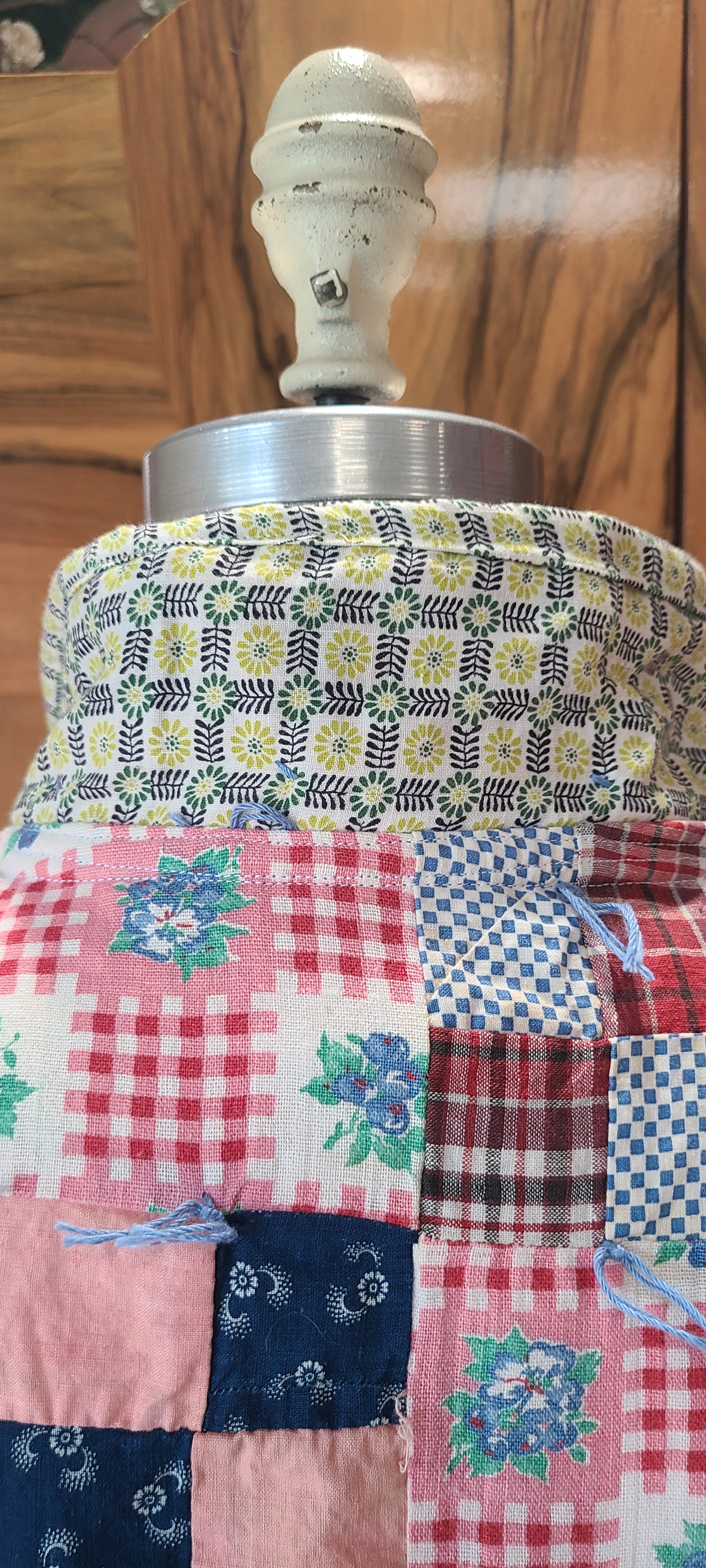 The 9 patch chore jacket features an array of primary colors. It includes button closures in red, complemented by floral lining and trim in green and blue.