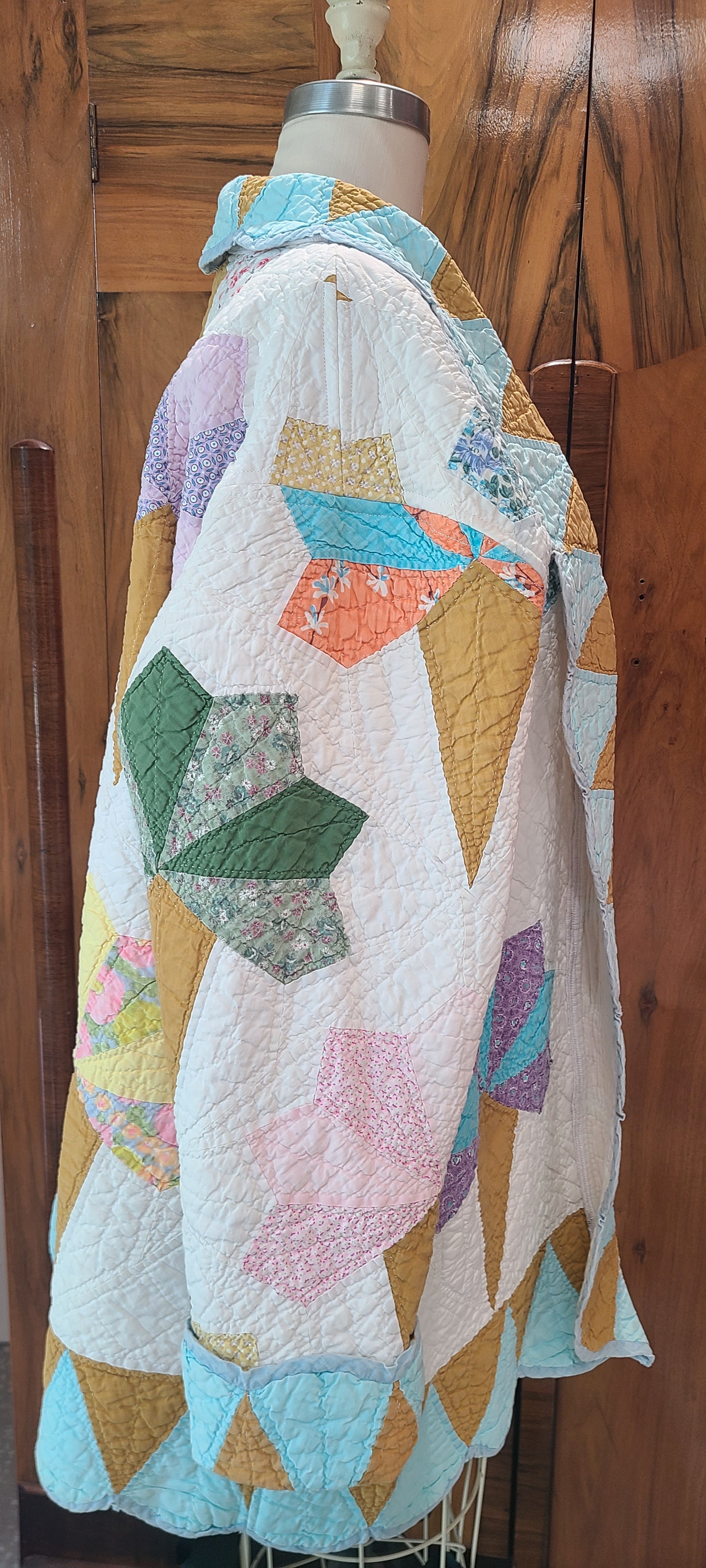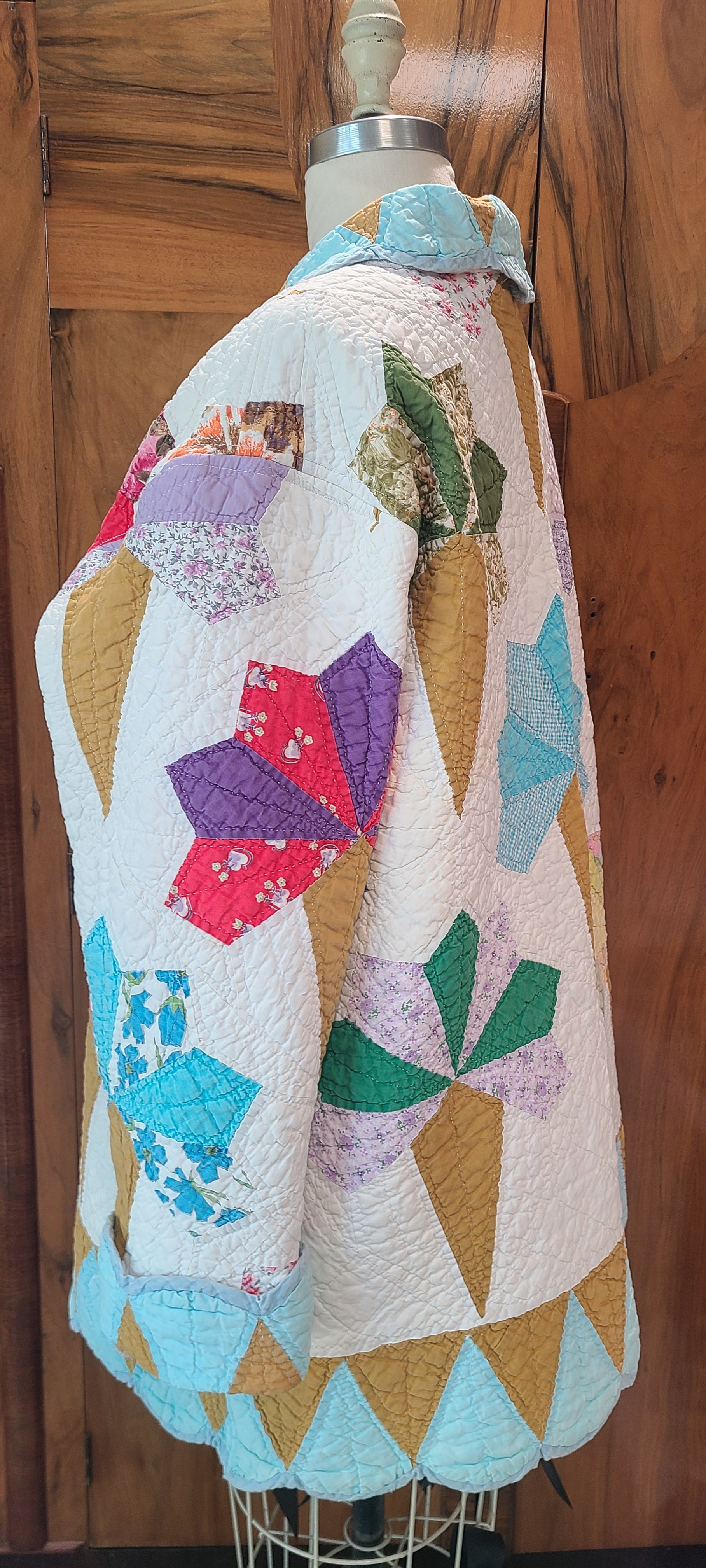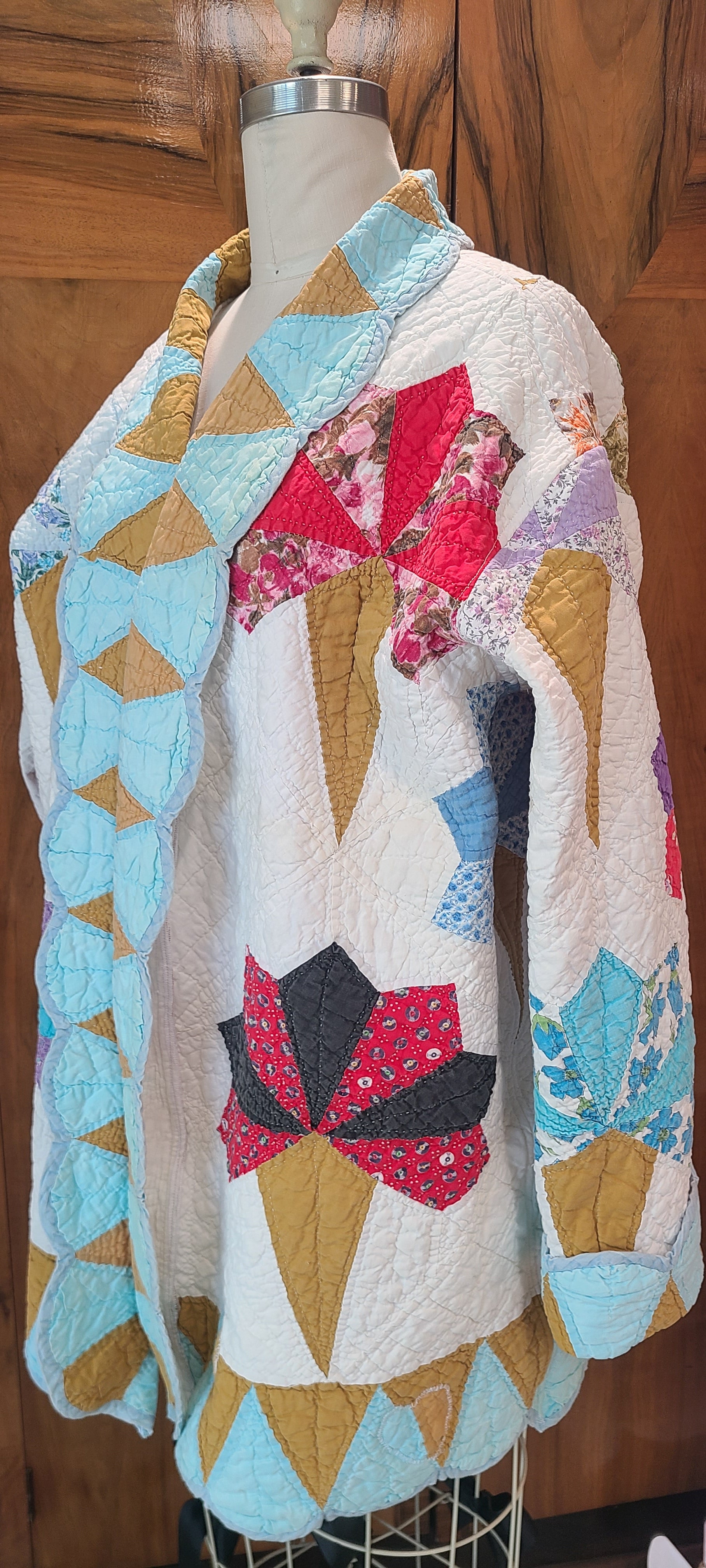 A floral bouquet or nosegay quilt has been transformed into a unique quilt coat. This garment offers a straightforward style suitable for various casual outfits.