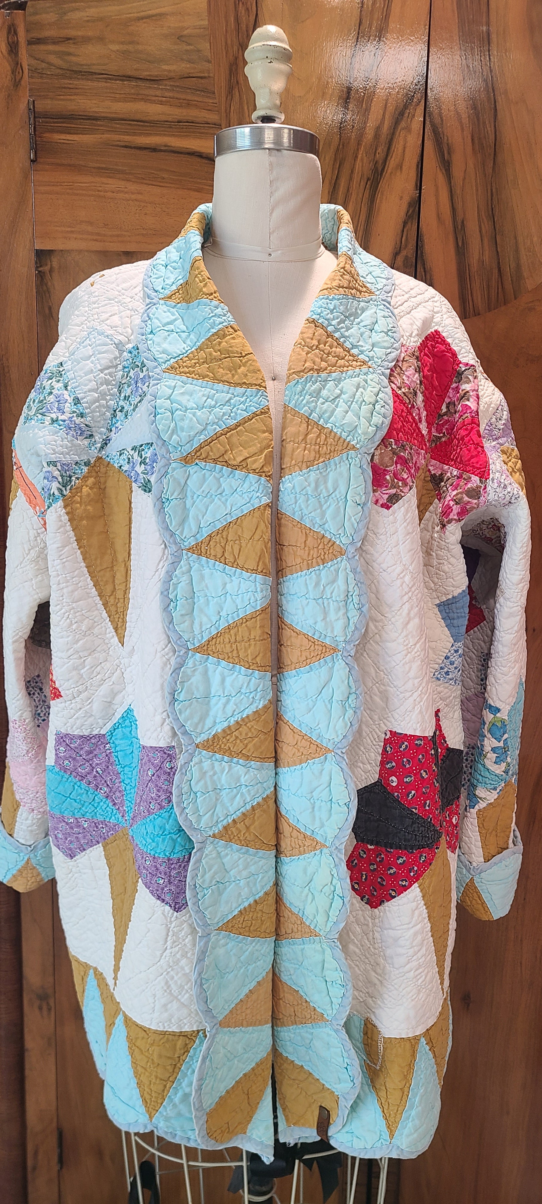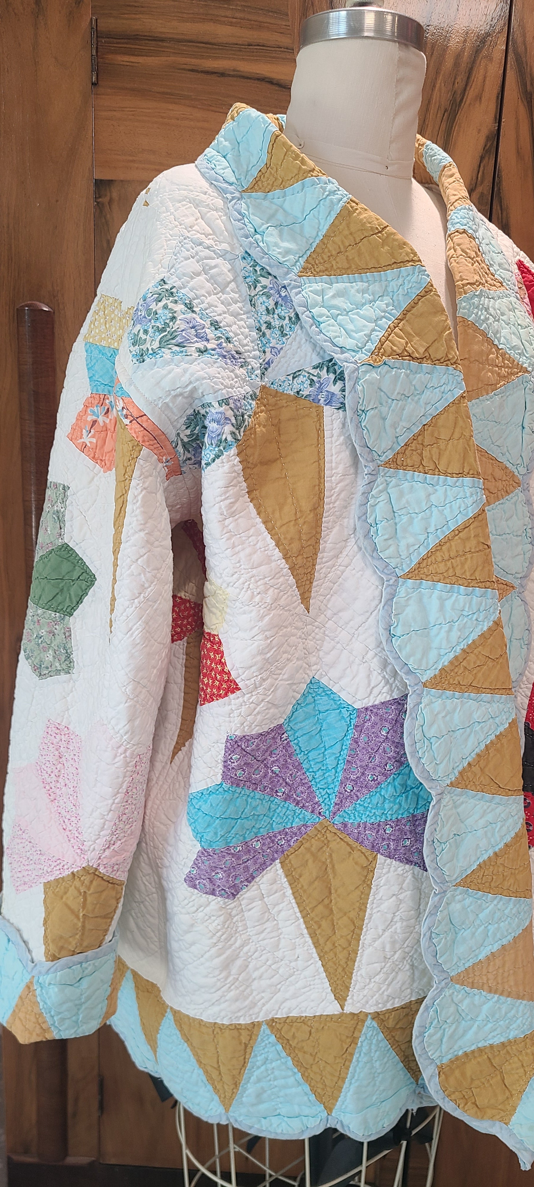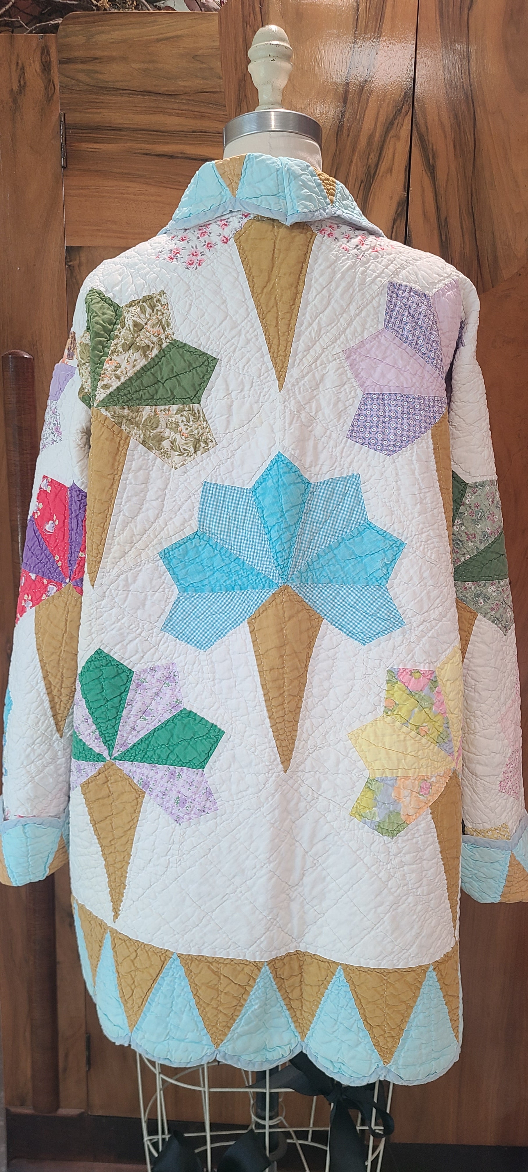 A floral bouquet or nosegay quilt has been transformed into a unique quilt coat. This garment offers a straightforward style suitable for various casual outfits.