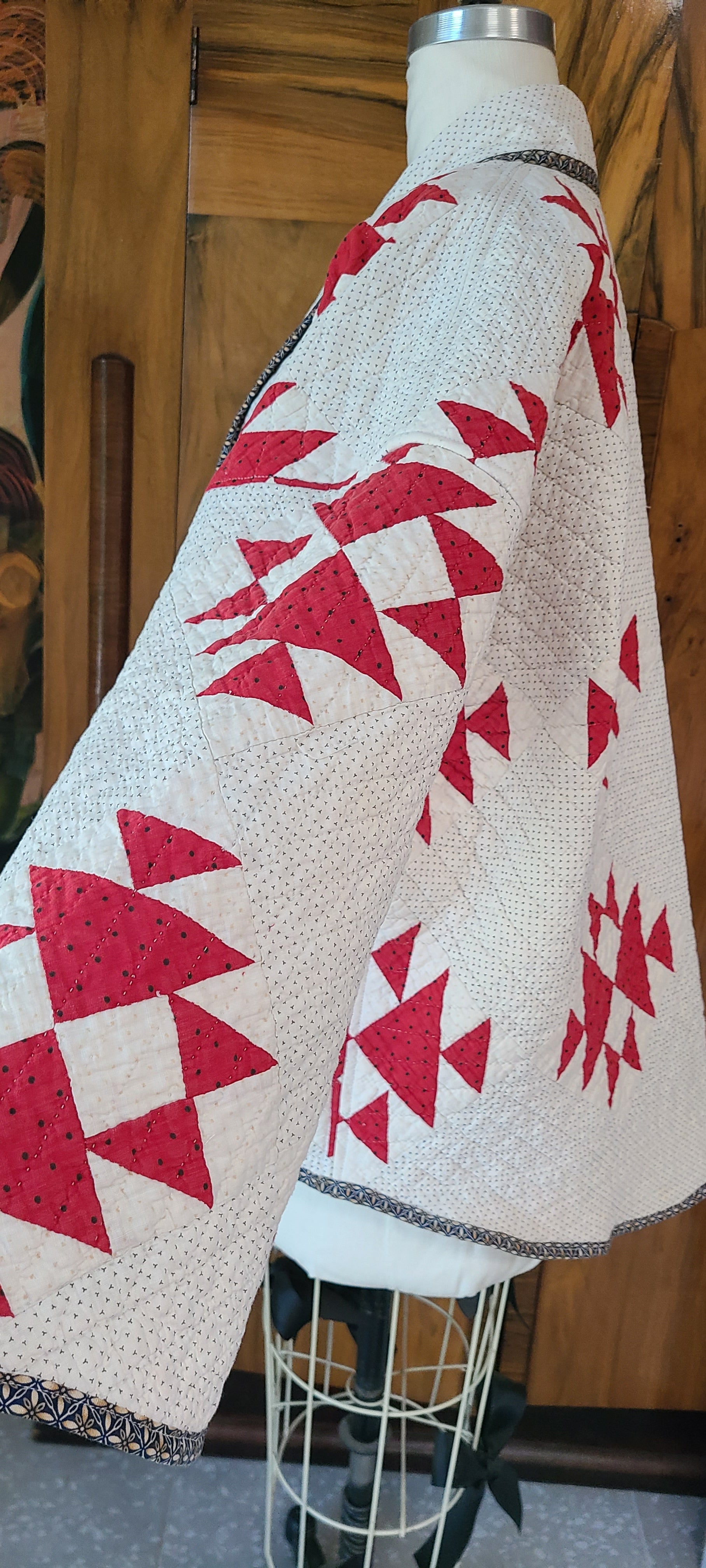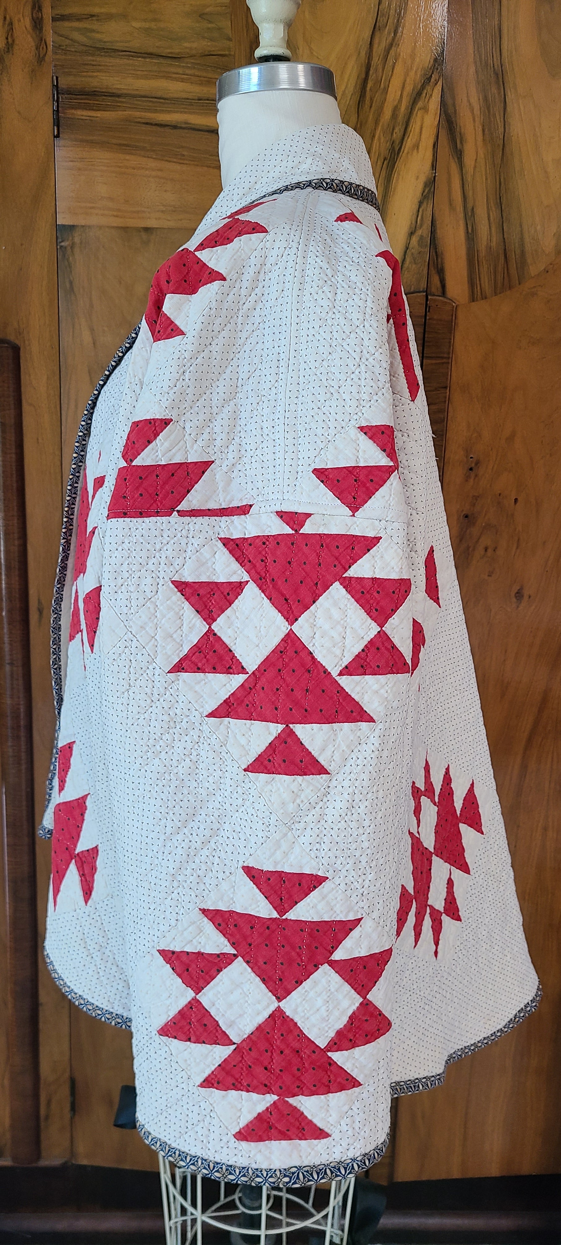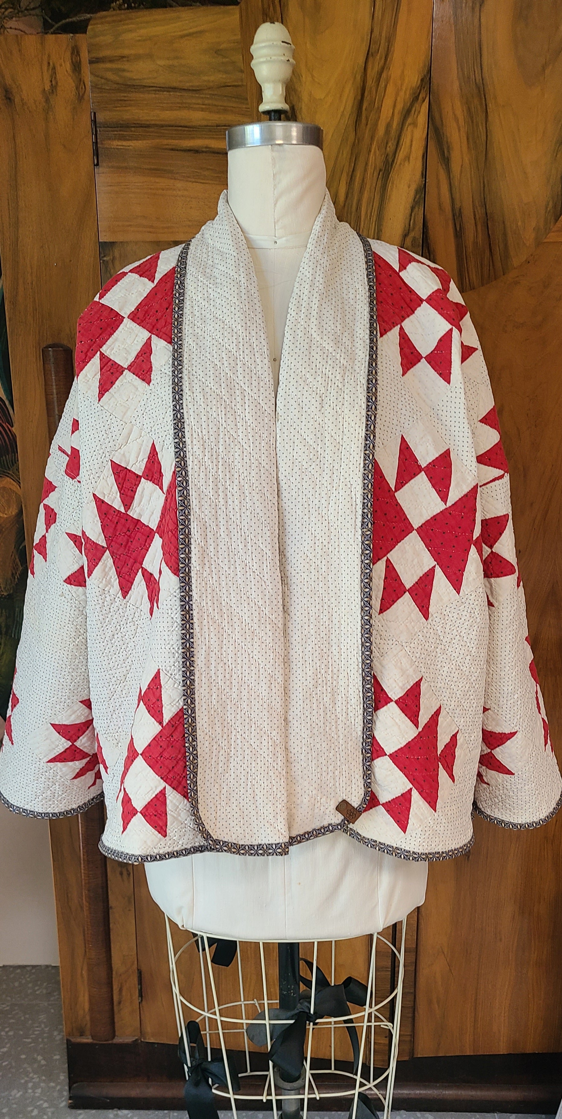 Beautiful vintage all hand stitched, red, white, and black quilt coat. Made in my Harper style.