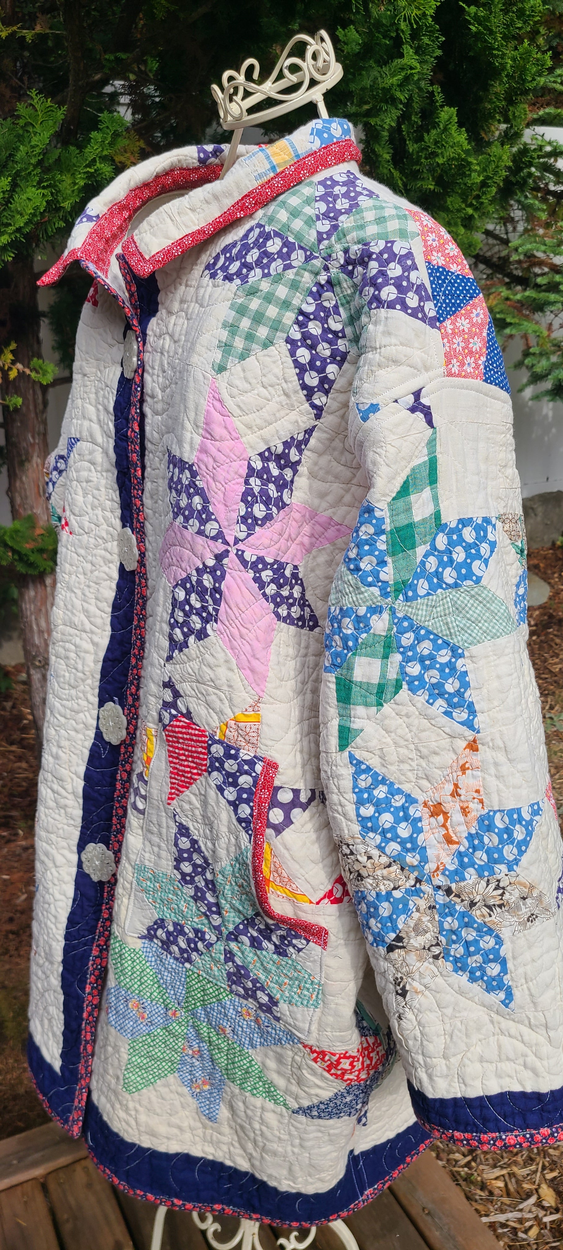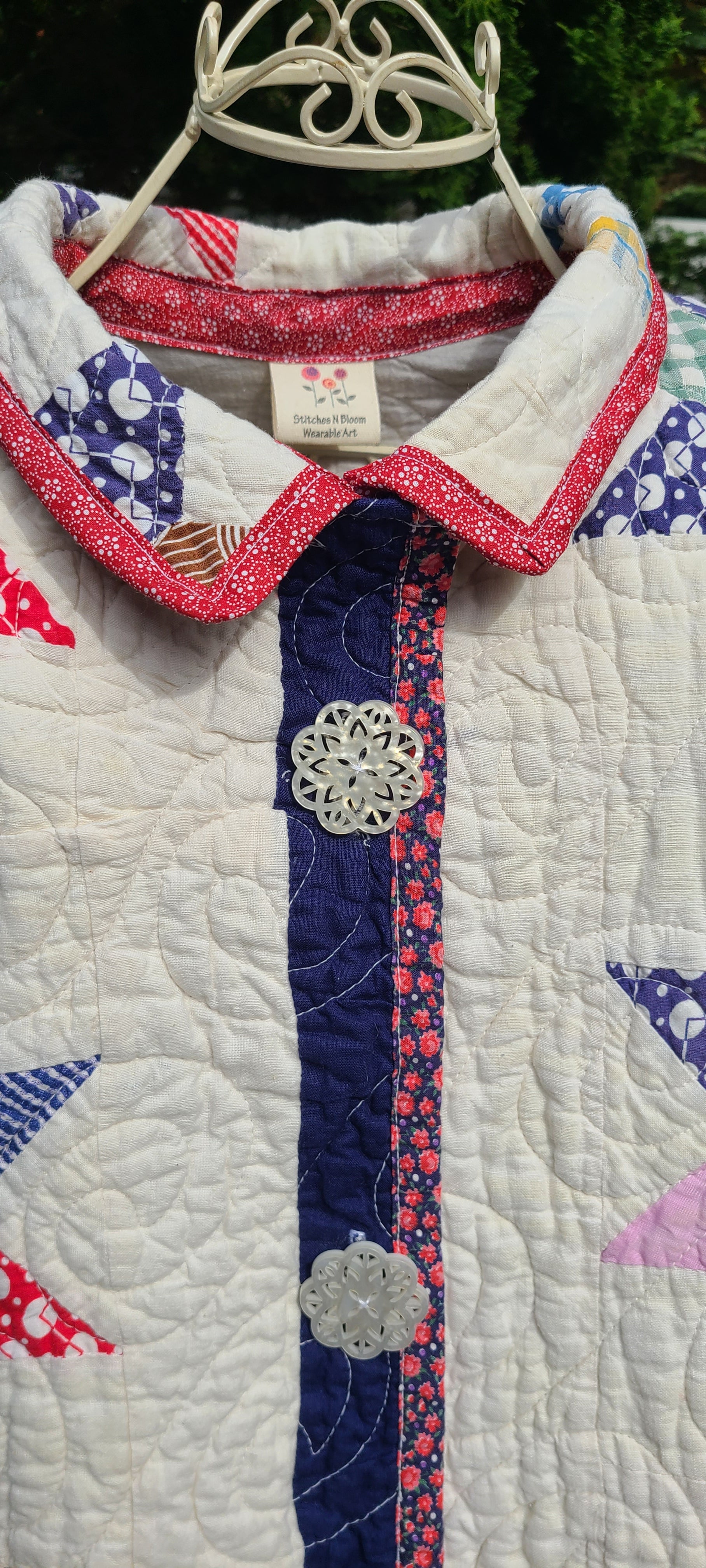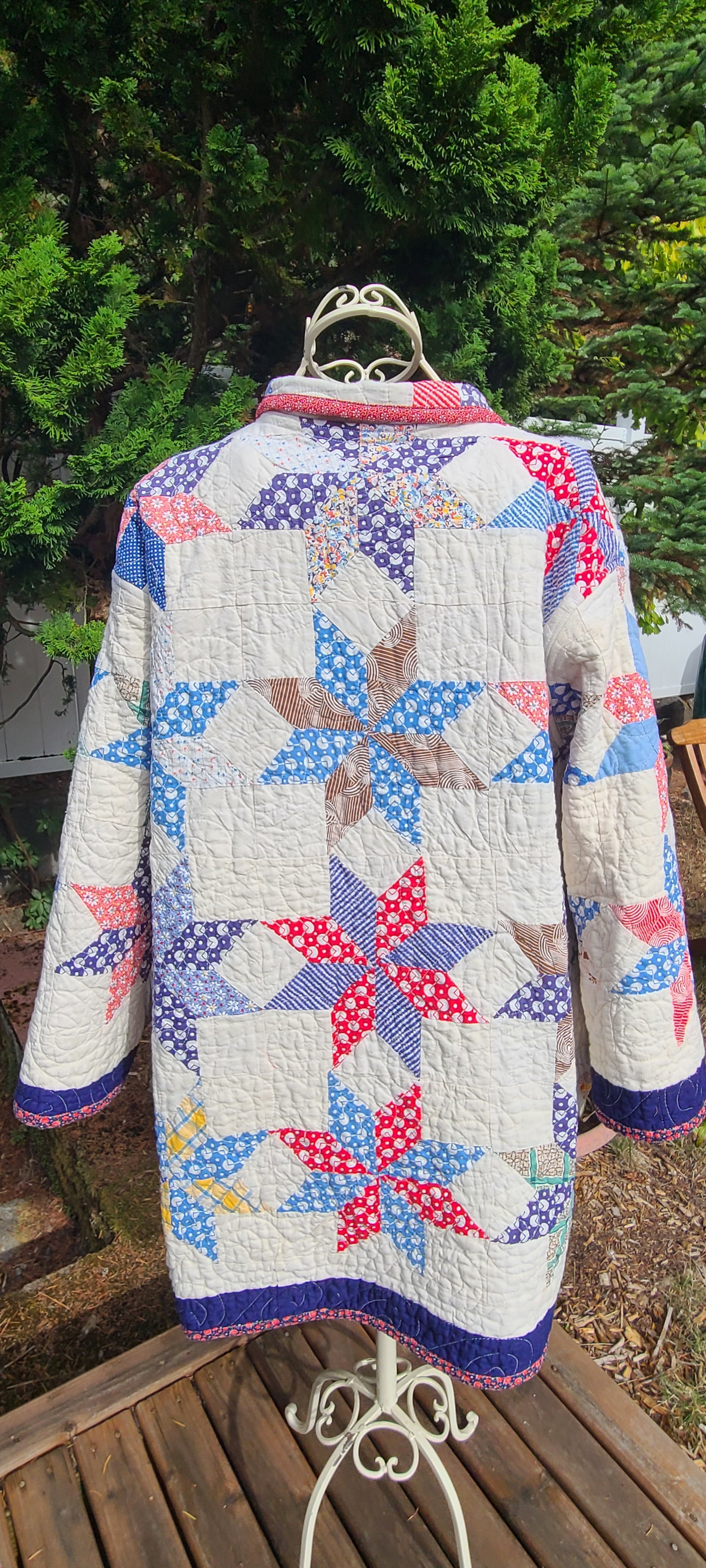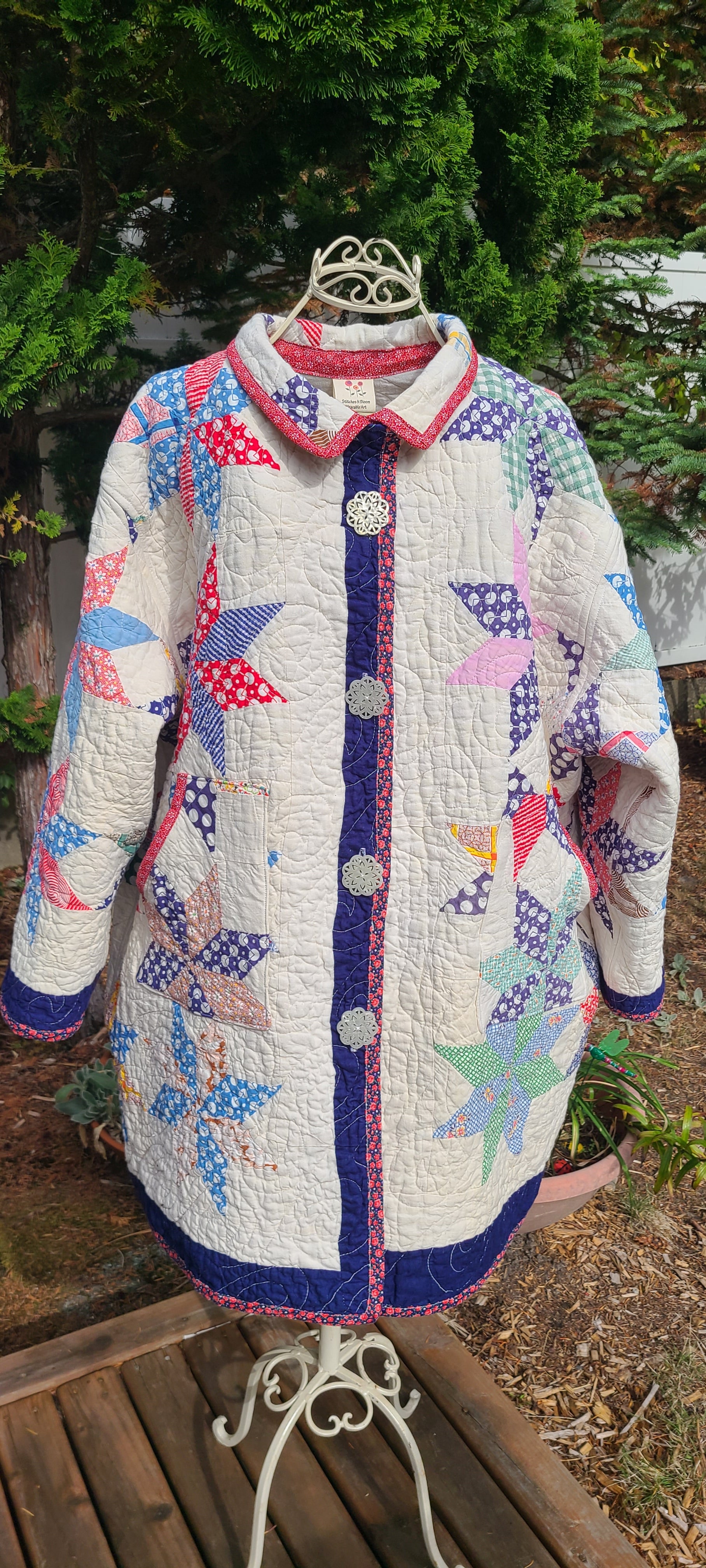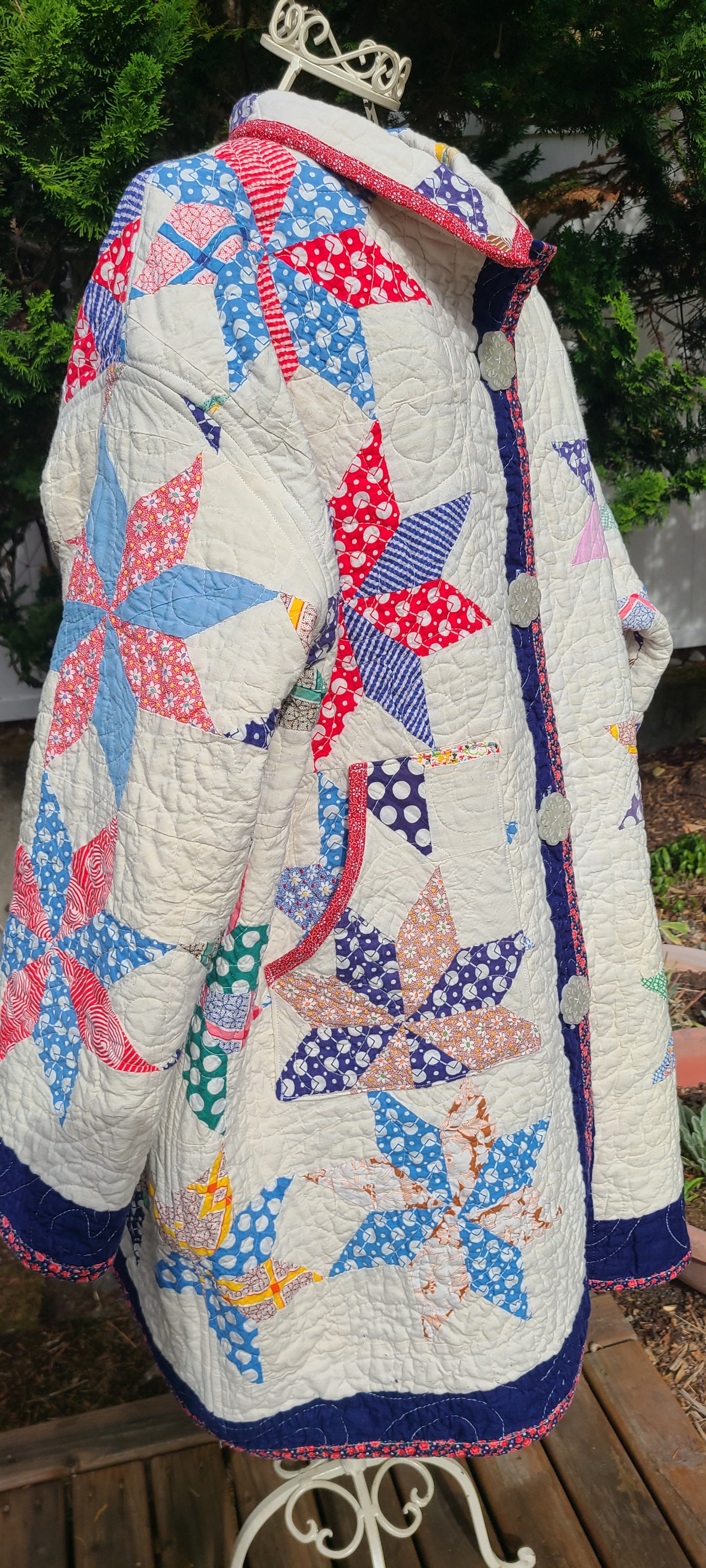 The Star Quilt Duster is an excellent choice for the colder seasons. Its larger style allows for easy layering, and it features beautiful snowflake button closures and front pockets.