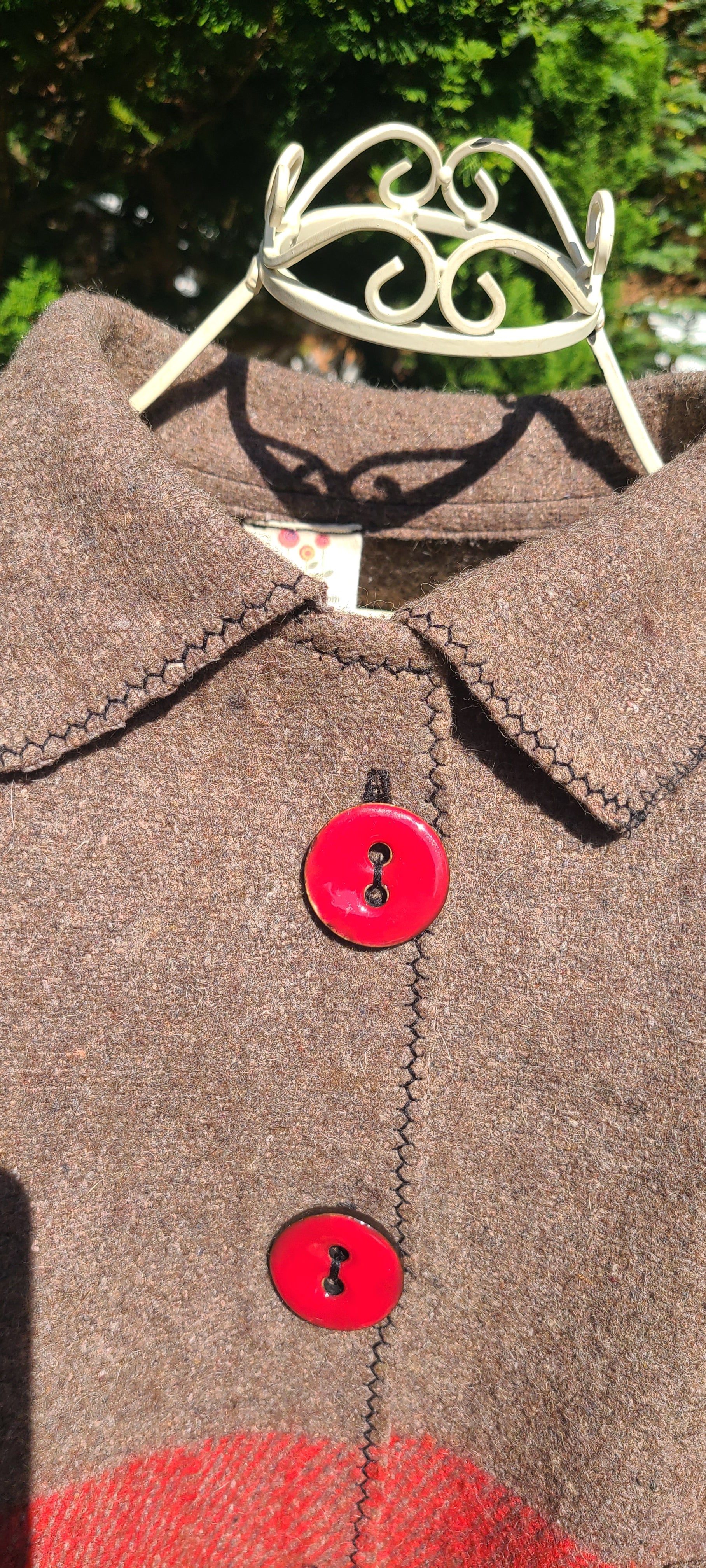 Transforming a vintage Swiss Army wool blanket into a fashionable chore jacket with enhanced edging and intricate stitching. Featuring eye-catching red button closures and convenient front pockets.